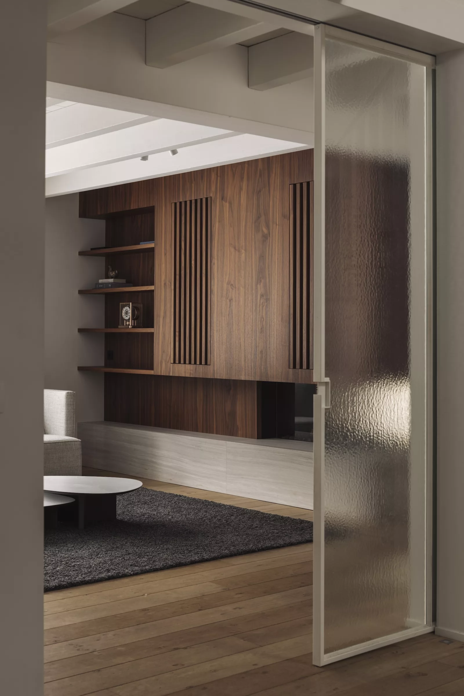Homeoffice, tv-kamer en zitruimte werden functioneel van elkaar gescheiden, maar bleven visueel met elkaar verbonden via een vrijstaande wand met doorkijkhaard en schuifdeuren. De ruime keuken bestaat uit 2 strakke evenwijdige lijnen bestaande uit een kastenwand met veel opbergruimte en een verborgen deur naar de bijkeuken. En een groot kookeiland uitwerkt in woodmarble. Het zorgvuldig samengestelde materialenpalet van lichte tinten, walnootfineer, koperaccenten en marmer werd consequent doorgetrokken over de volledige gelijkvloerse verdieping.