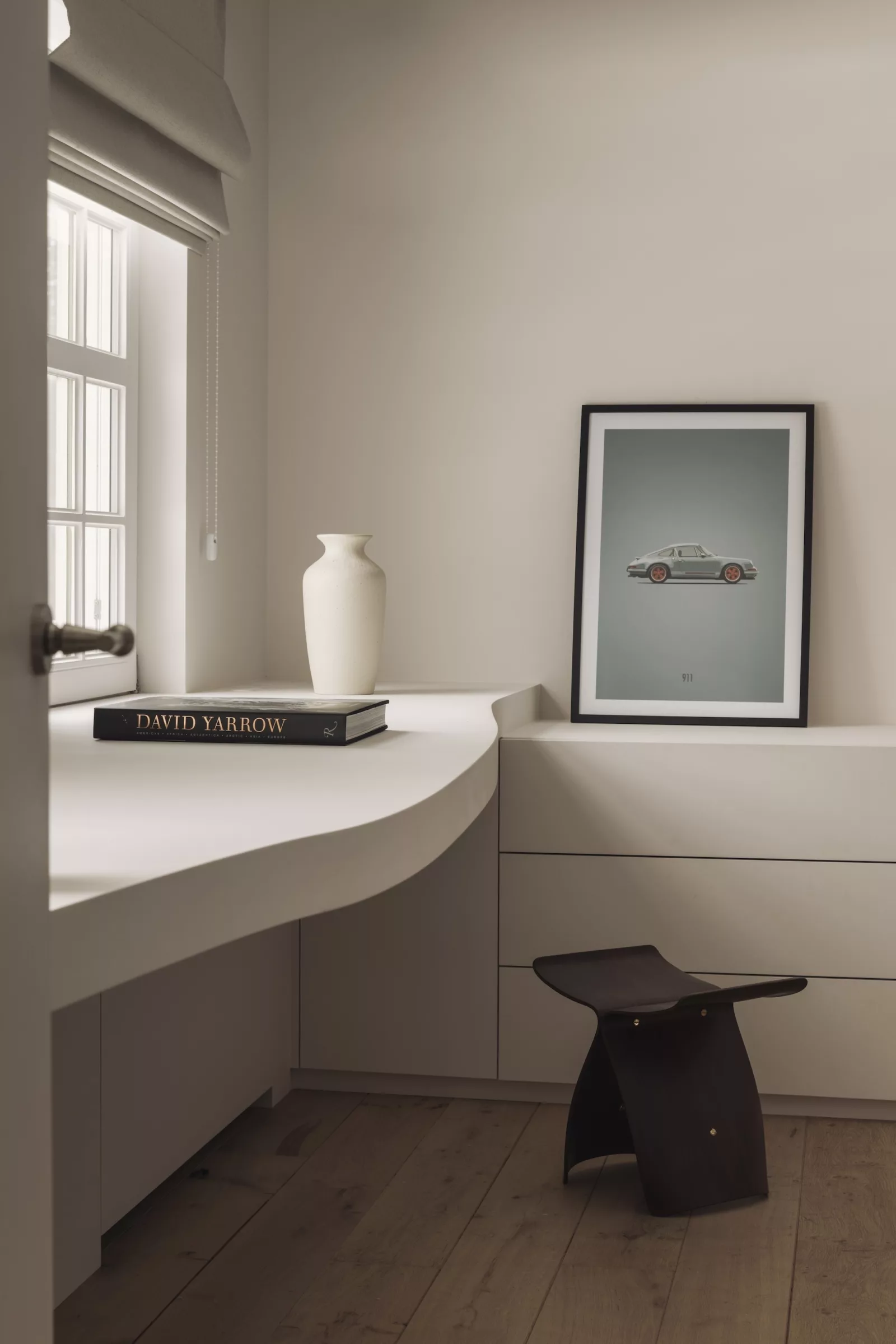 In de tweede fase werd de slaapverdieping volledig heringericht. De master bedroom onderging een grondige verbouwing en werd uitgebreid met een nieuwe badkamer en een dressing. Het bed kreeg plaats binnen een gestoffeerde cocon, opgebouwd uit halfronde wanden en afgewerkt met een zachte stofbekleding. In combinatie met een schildertechniek kreeg de ruimte een warme en geborgen uitstraling.
