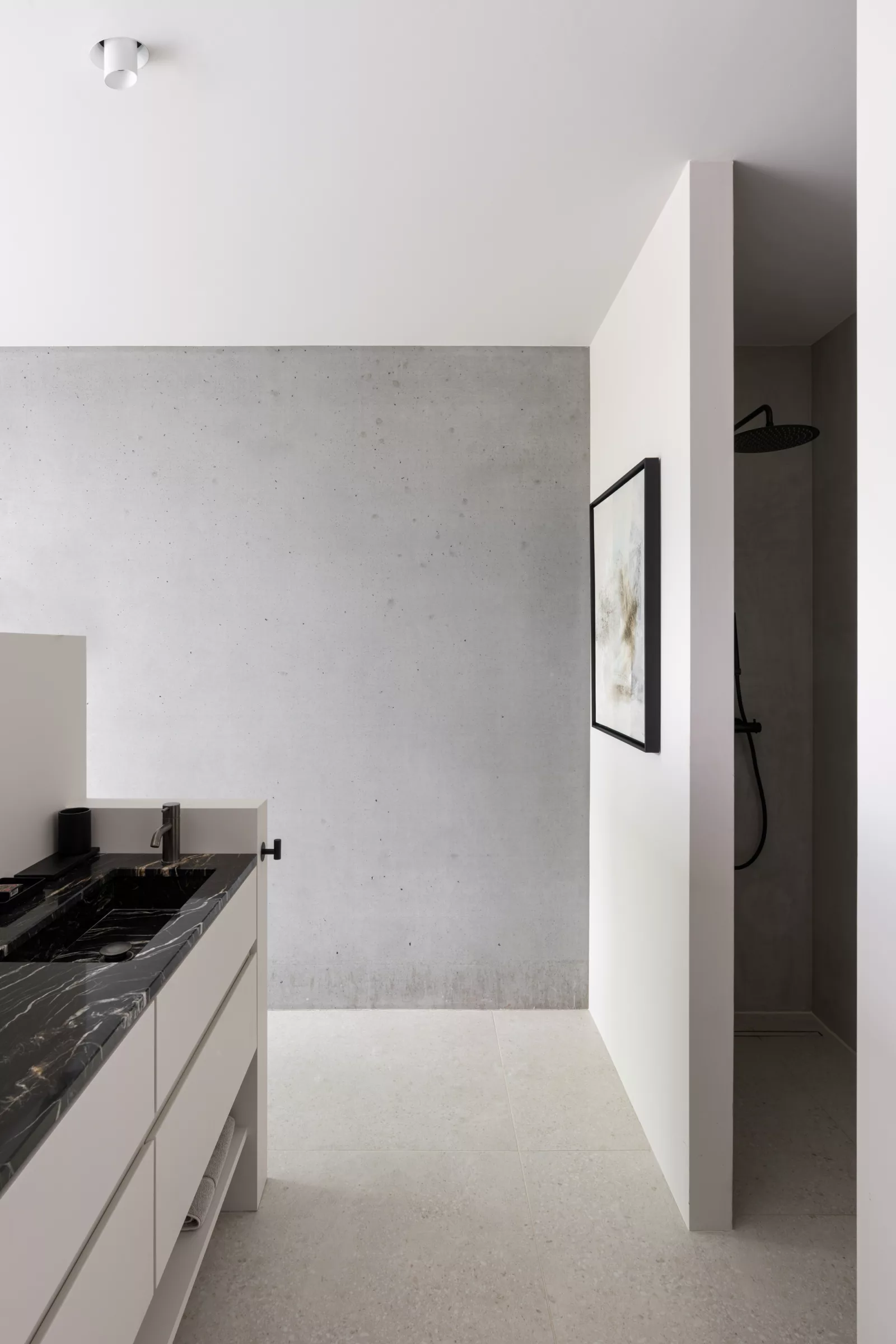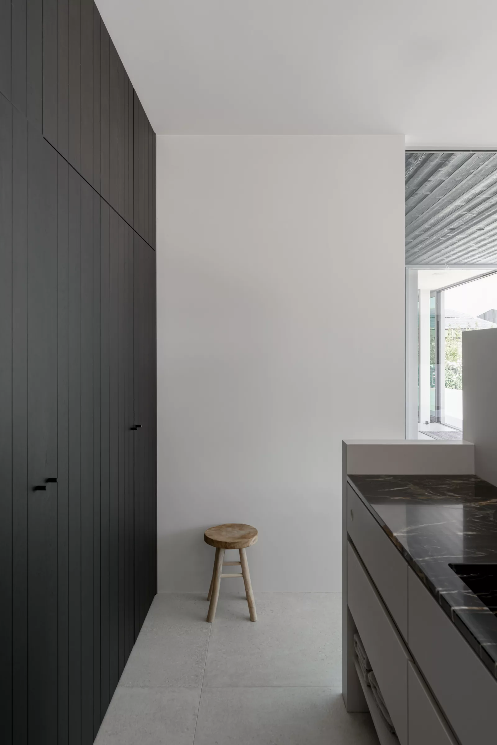 Binnen is het materiaalgebruik van de schuur subtiel doorgetrokken. Zwart gebeitste eik en donkere accenten brengen een rustige ritmiek in het interieur. Het kleurgebruik blijft beperkt, om zo de nadruk op de rustige betonarchitectuur te leggen.
