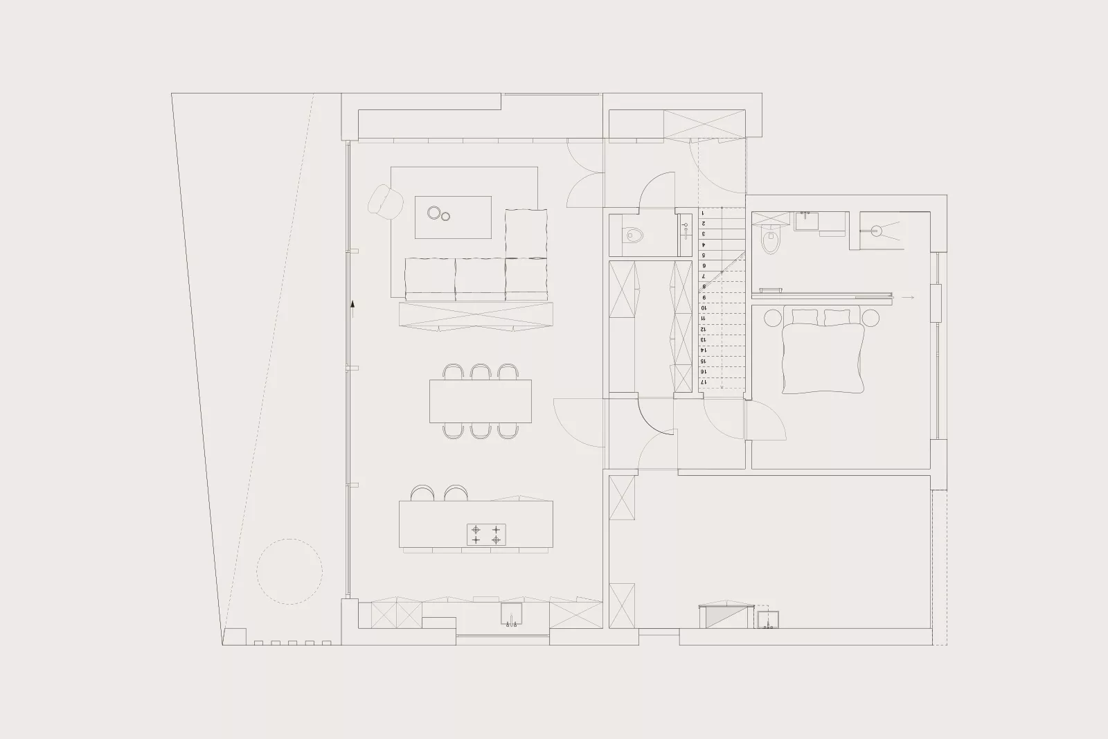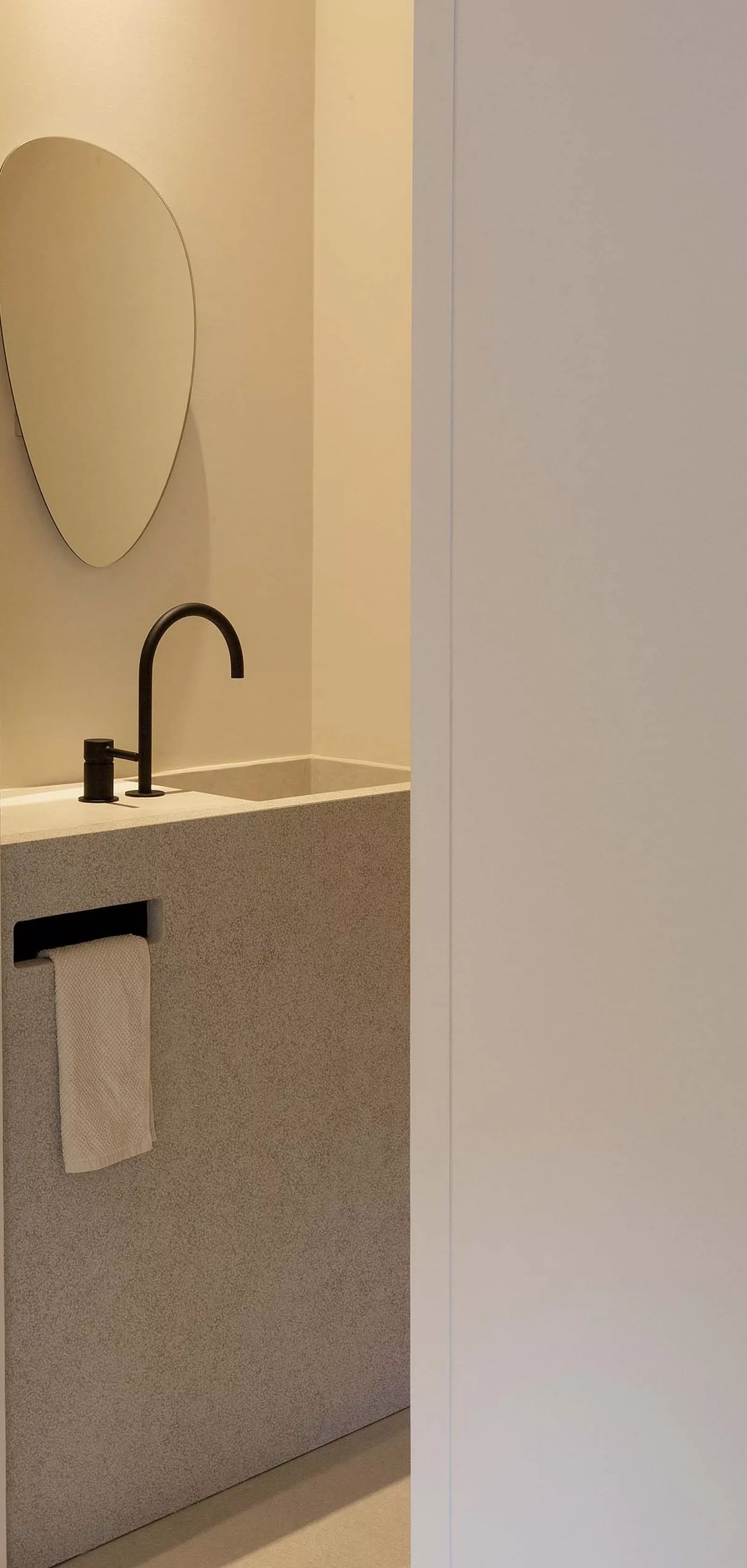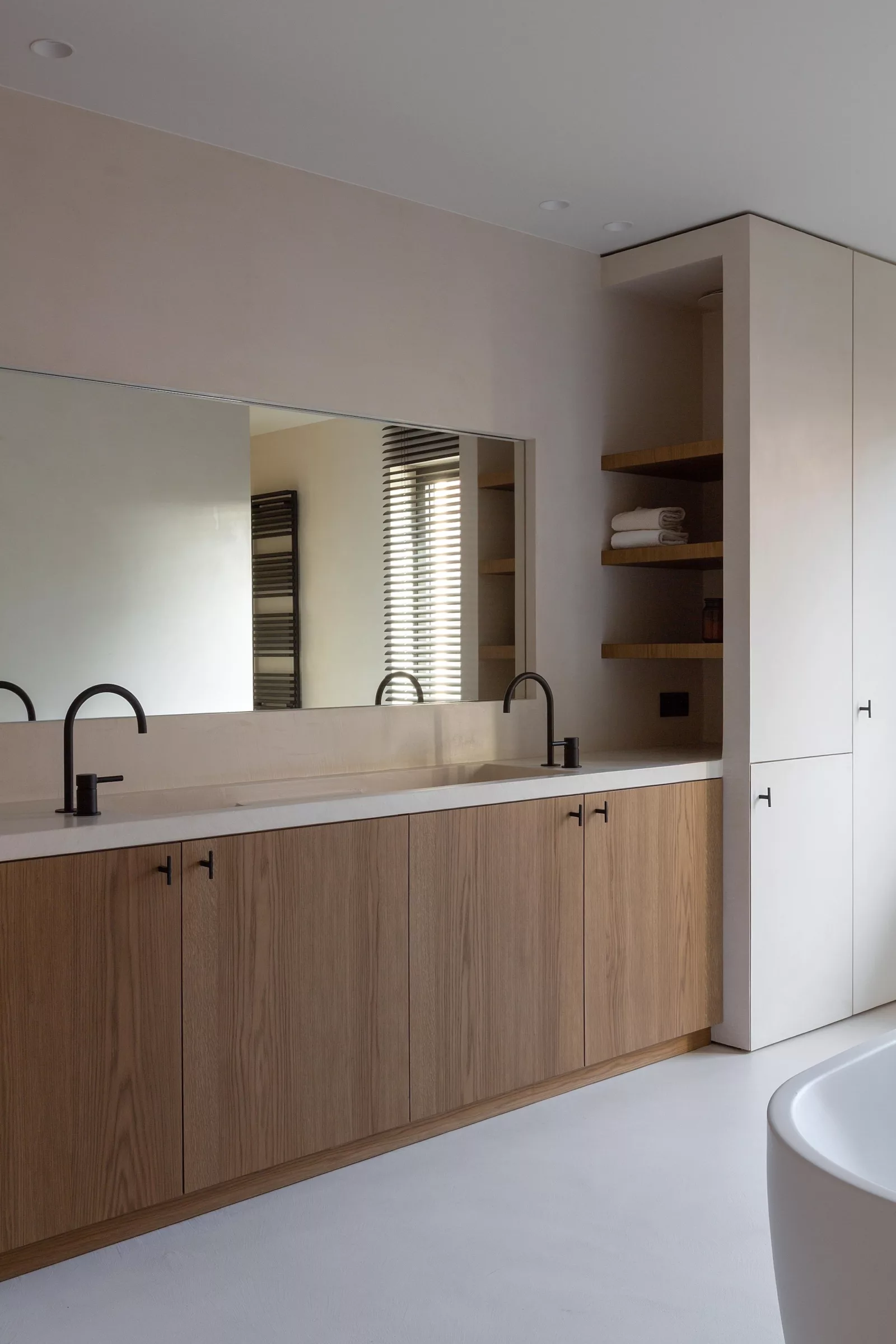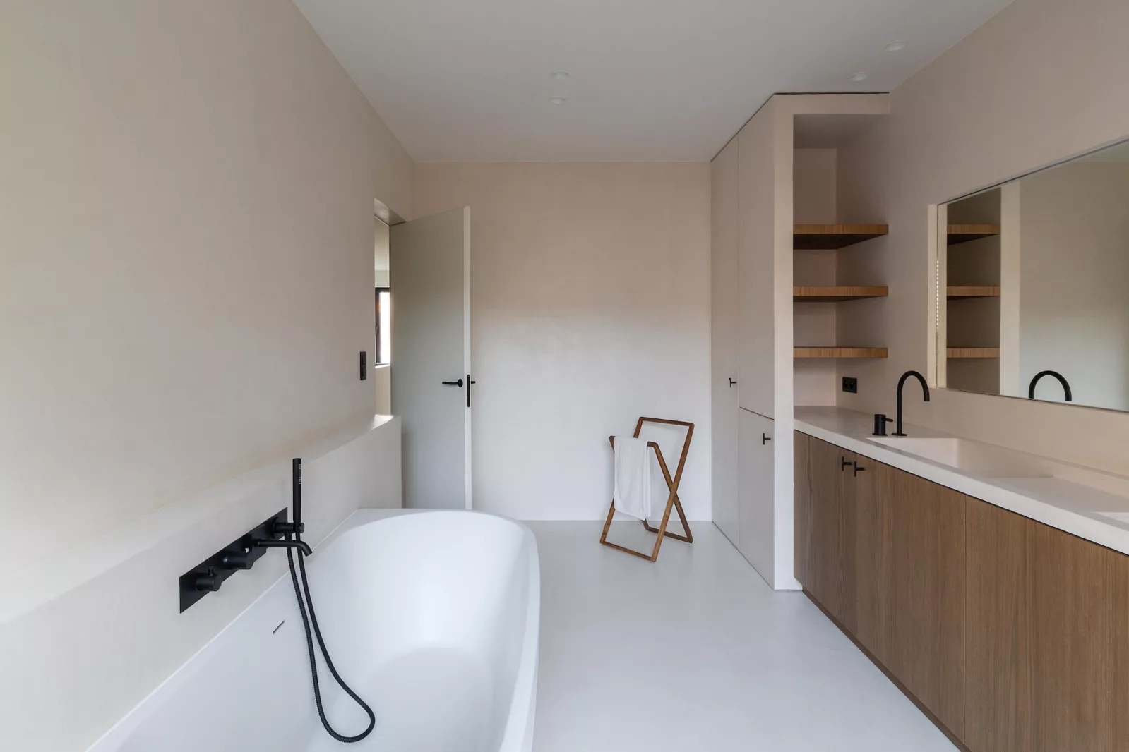 Doorheen de woning komen overal dezelfde subtiele details terug: ingewerkte plinten in de muren, alsook ingewerkte houten plinten op de verdieping die vloeiend overgaan in het parket, en wanden afgewerkt met een warme borsteltechniek in verticale beweging.