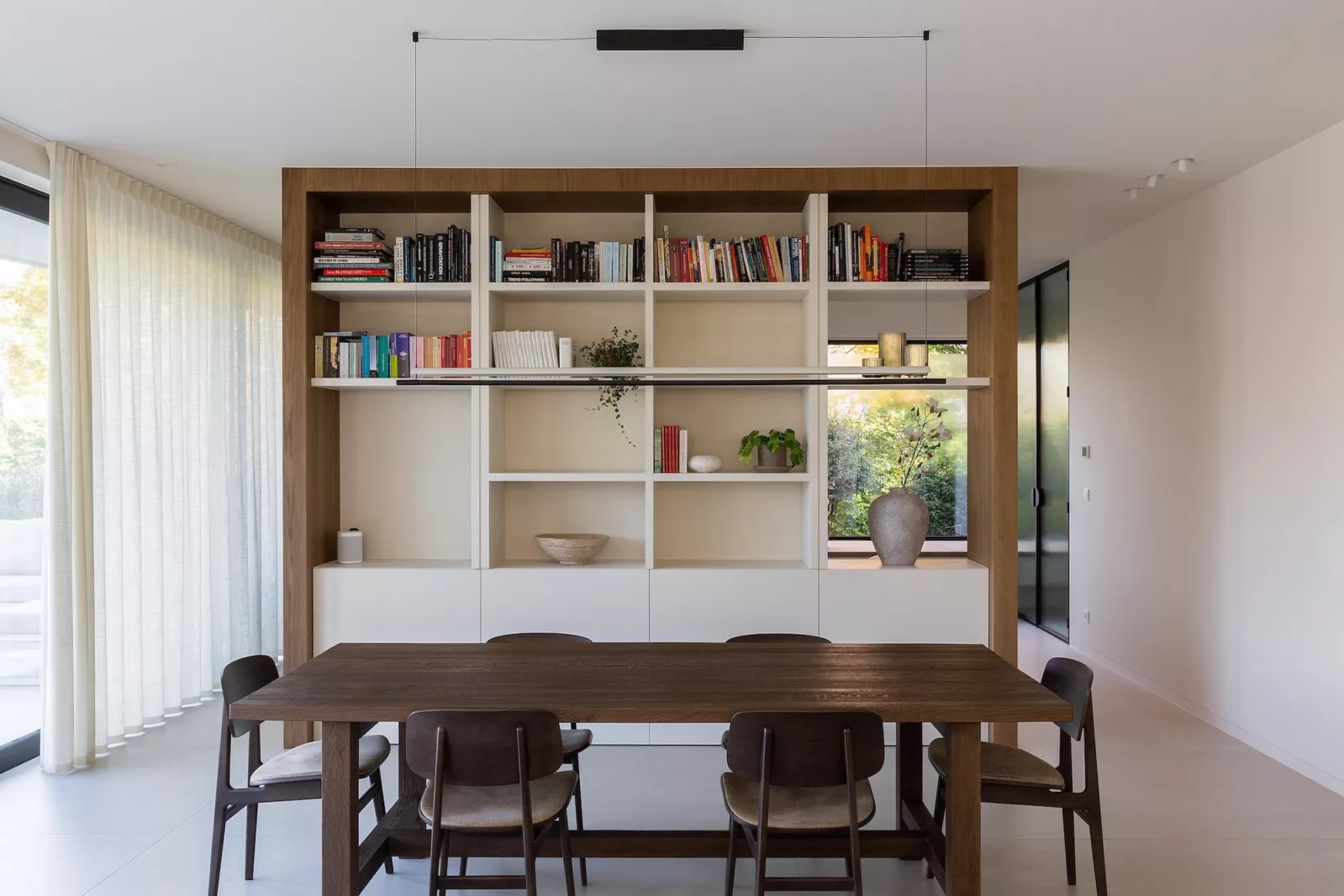 Van bij de inkom ervaar je hoe het interieur vloeiend doorloopt. Een zitbank leidt je van de inkomhal naar de intieme tv-hoek, die deels wordt afgeschermd van de eetkamer en keuken door een maatwerkwand. Deze wand is halfopen opgevat, waardoor er toch visuele connectie blijft tussen de ruimtes. Die verbinding wordt versterkt door het consequent doorlopende tegelvloer en het gebruik van dezelfde houtaccenten in verschillende zones.